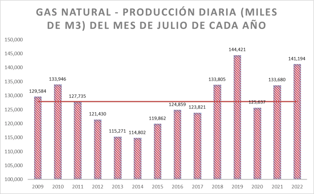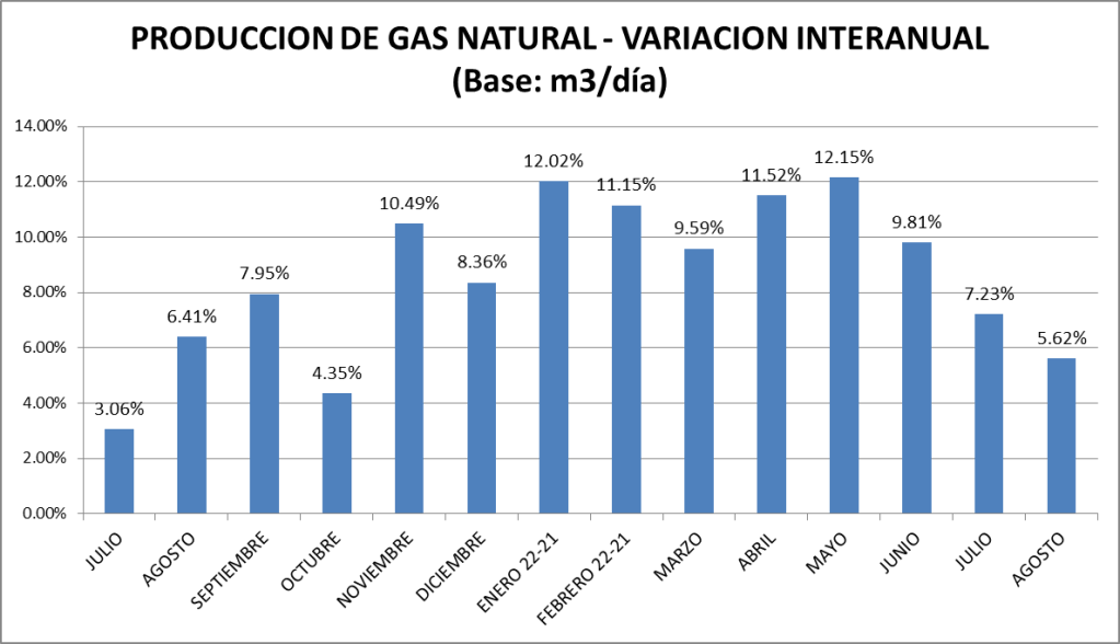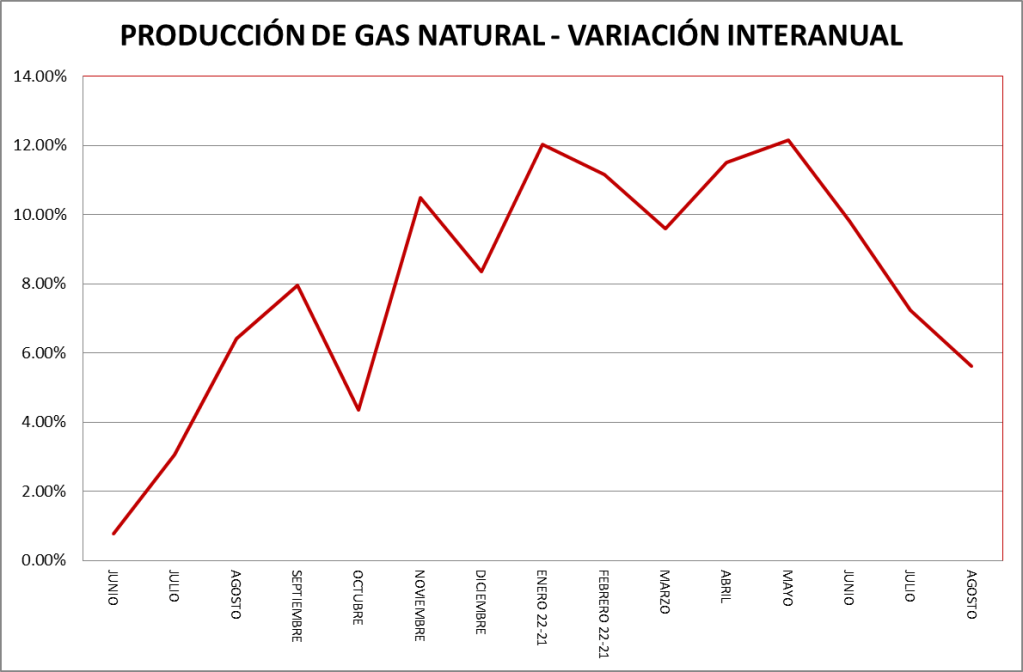 La producción de gas natural de los meses de agosto de cada año puede verse en el gráfico a continuación: