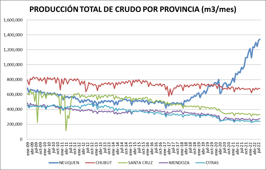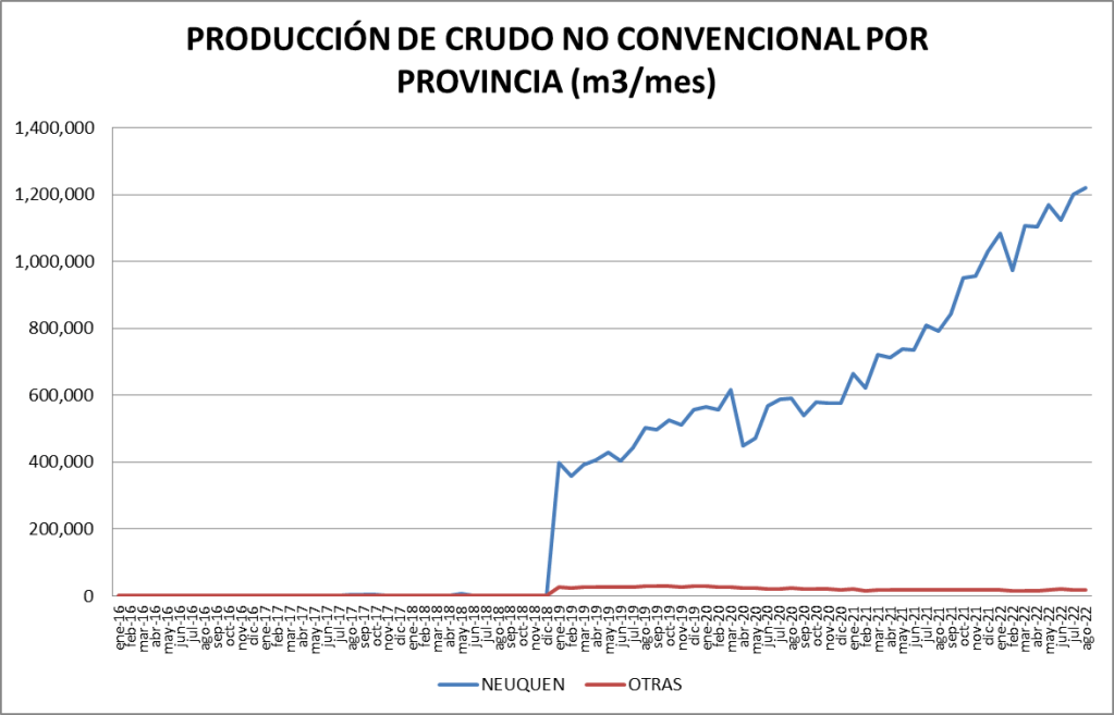 La participación del crudo no convencional en el total de la producción nacional fue, en agosto de 2022, del 43,17%, el mejor valor de la serie.