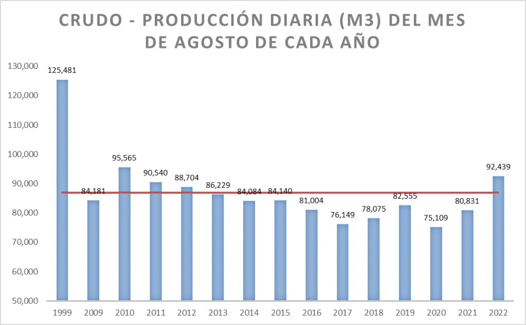 De los meses de agosto de los últimos años, la producción de crudo del año 2022 se ubica en la cuarta posición, detrás de 2010, 2011 y 2012. Pero, muy lejos todavía del valor de producción diaria de agosto de 1999.