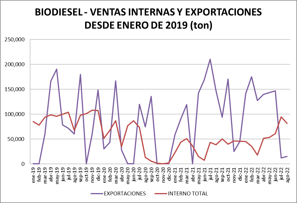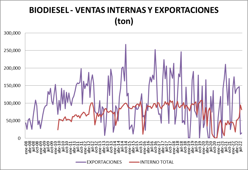 Para el biodiesel, la información parte desde enero de 2008 para las exportaciones y desde febrero de 2010 para la venta a refinerías.