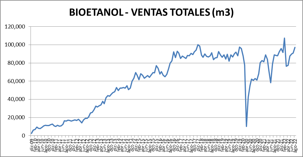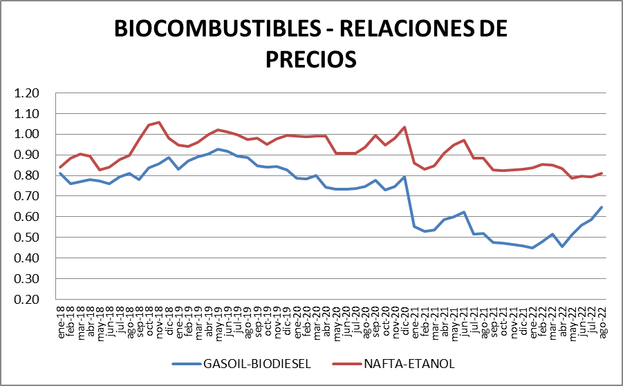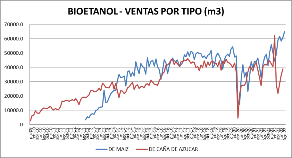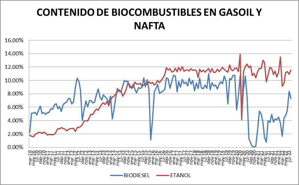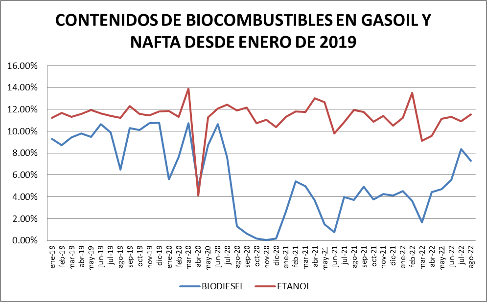 No pasa lo mismo con el etanol (probablemente por el aporte de octanos al blend de naftas). El contenido de bioetanol en naftas fue del 11,6% en agosto de 2022 respetando el promedio histórico.