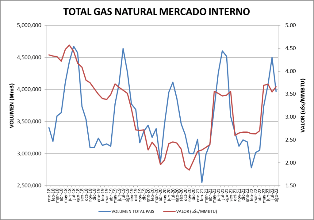 El volumen total comercializado en el mercado interno (128,1 MMm3/día) resulta, en agosto de 2022, un 12,1% inferior al mismo mes del año anterior y un 11,8% superior a julio de 2022.