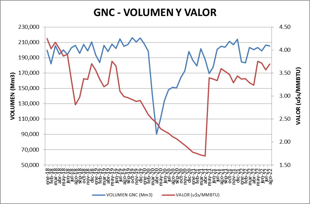 Se vendieron, en agosto de 2022, 6,6 MMm3/día de Gas Natural Comprimido, valor sin variantes respecto al mes anterior y también casi idéntico al de agosto de 2021.