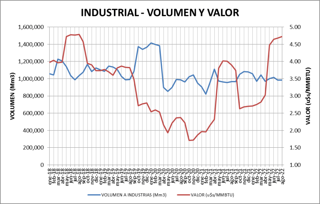 El valor del gas natural con dirección al sector industrial subió un 0,85% en agosto de 2022 respecto a julio de 2022.