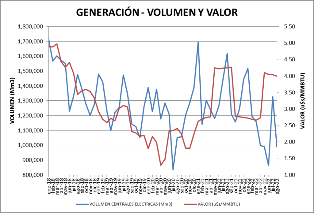 En cuanto al valor de las exportaciones (7,87 u$s/MMBTU), bajaron en agosto un 6,6% respecto a julio (7,97 u$s/MMBTU).