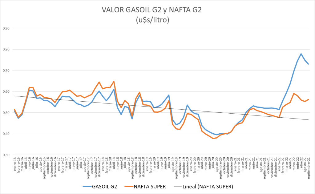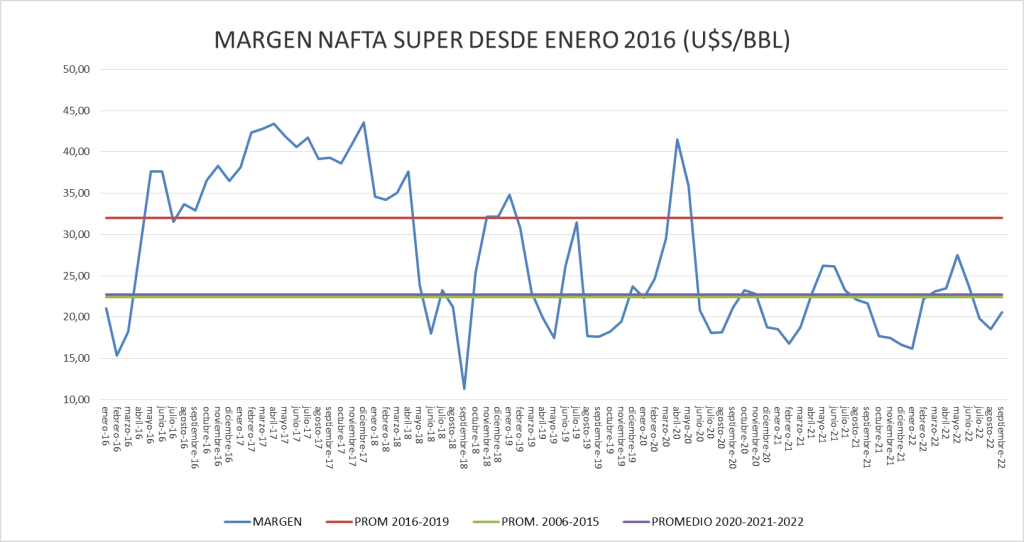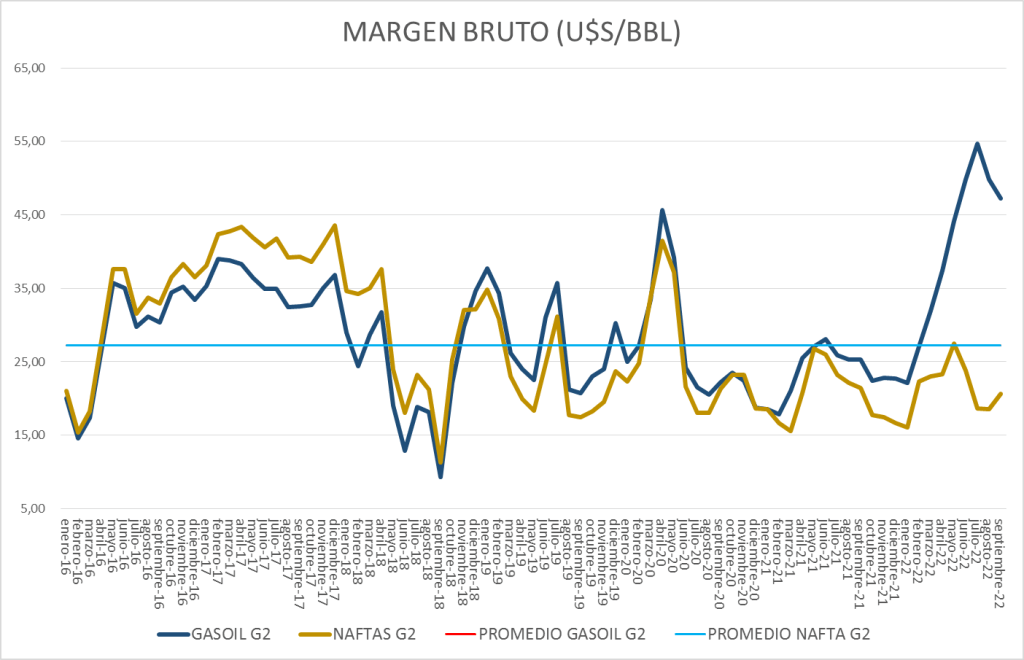 En septiembre de 2022 se produce una disminución del Margen Bruto de Refinación del gasoil grado 2 de un 5,08%, acumulando una caída del 13,5% en dos meses. Mientras que el de la nafta súper sube un 11,23%, ambos respecto a agosto del mismo año.