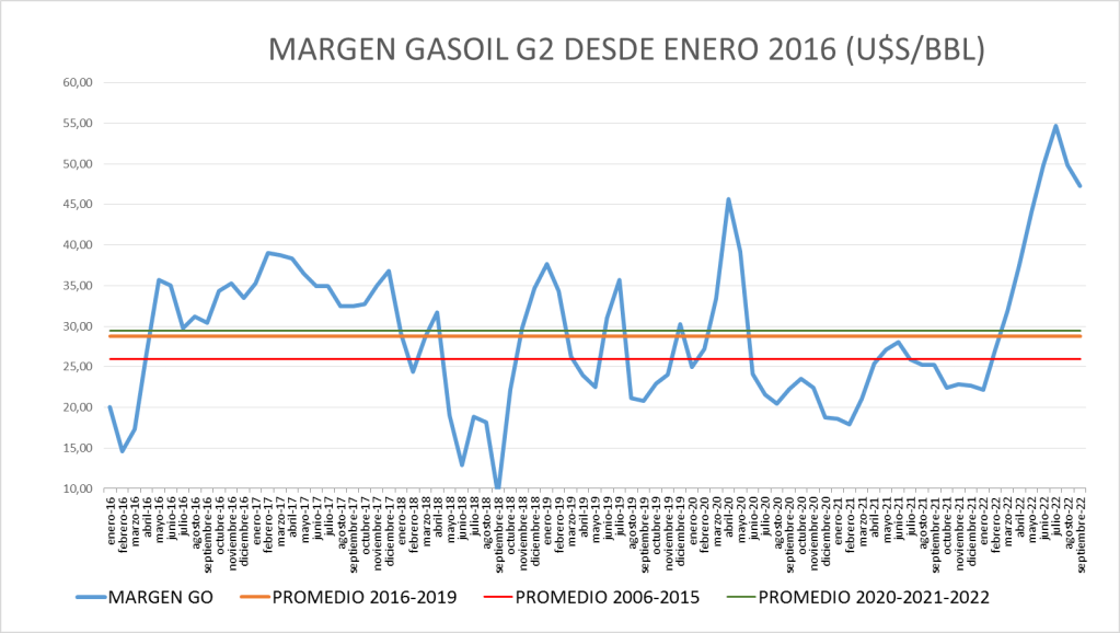 El Margen del gasoil grado 2 de septiembre de 2022 (47,29 u$s/bbl) se sitúa por encima del promedio del período enero de 2016 a julio de 2022 (27,24 u$s/bbl).