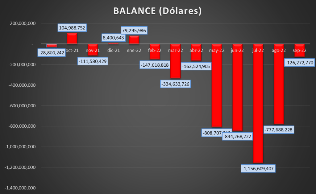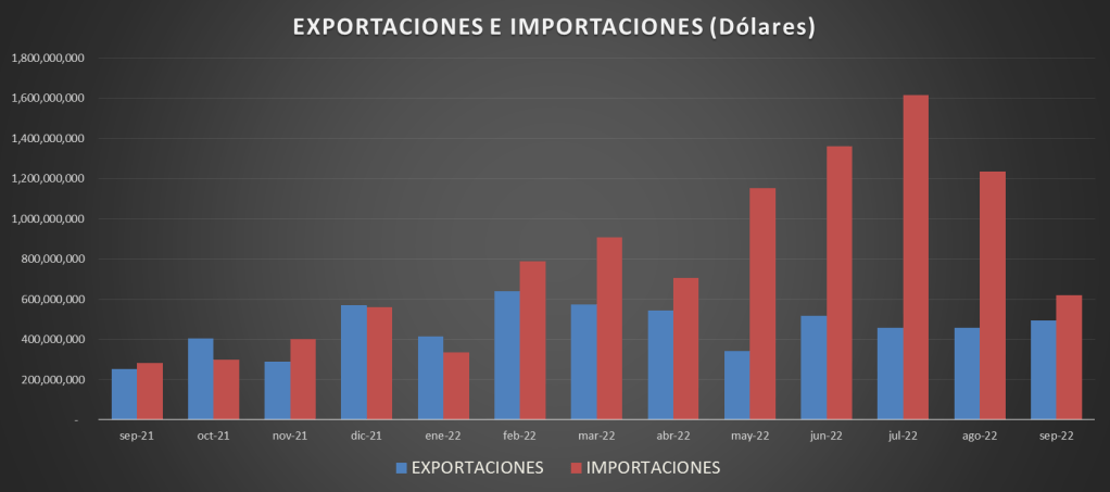 Las importaciones totales en septiembre de 2022 fueron de 620,7 MMu$s y las exportaciones de 494,4 MMu$s, resultando un balance negativo de 126,3 MMu$s.