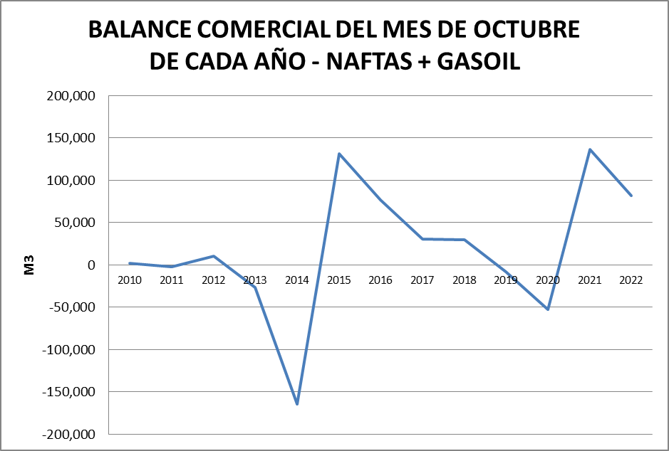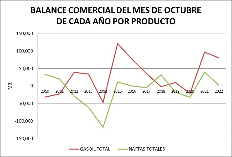 Vemos en el gráfico que en octubre de 2022 el balance de la serie resulta positivo para la suma de los cuatro productos, llegando a +81.742 m3, con negativos en gasoil grado 2 (-116.201 m3) y en nafta grado 2 (-46.196 m3).