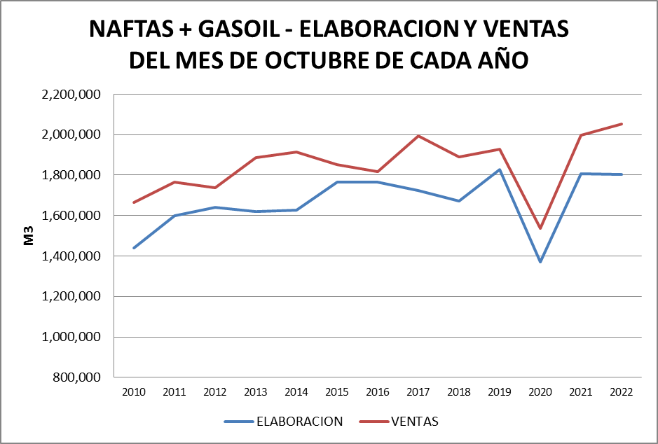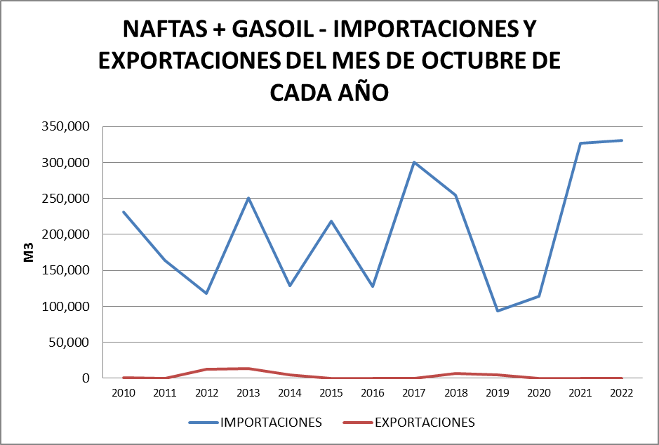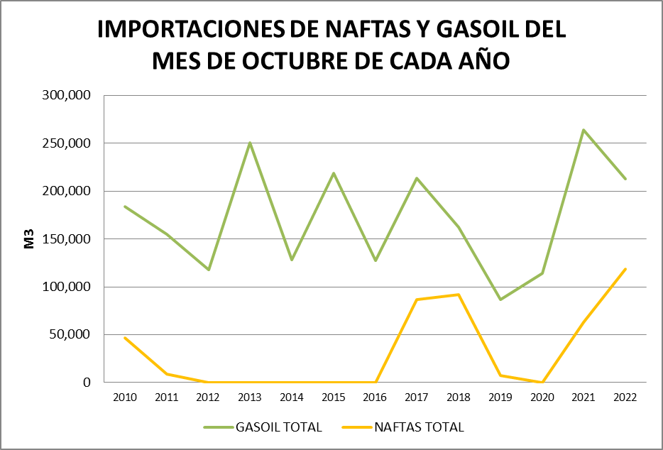 El volumen importado de naftas y gasoil en octubre de 2022 (331.061 m3) resulta el mayor de la serie.