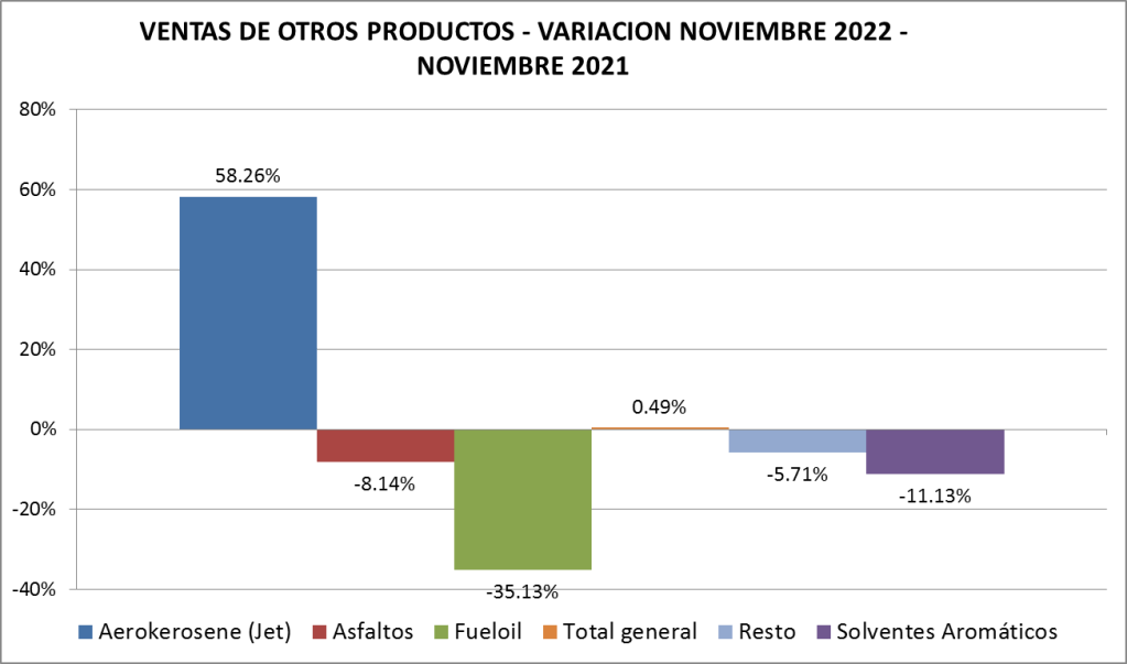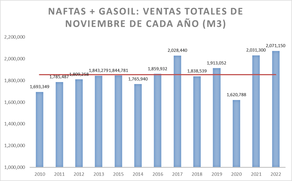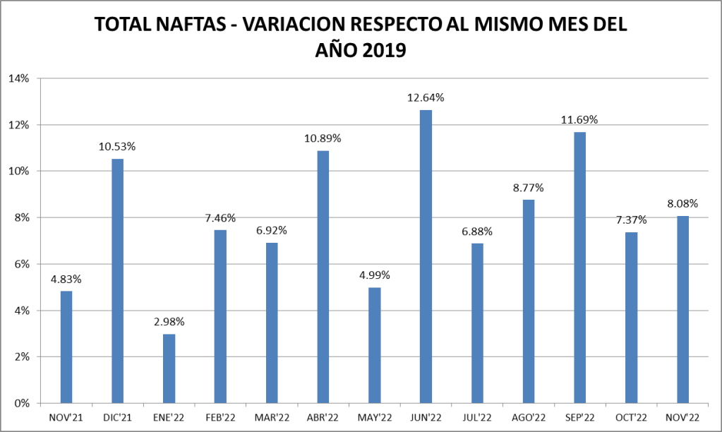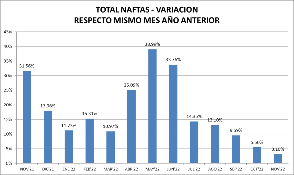 Las ventas muestran, en noviembre de 2022, la continuación de un buen grado de recuperación respecto al año anterior, aunque sigue desacelerando el crecimiento, ahora más notorio en las naftas.