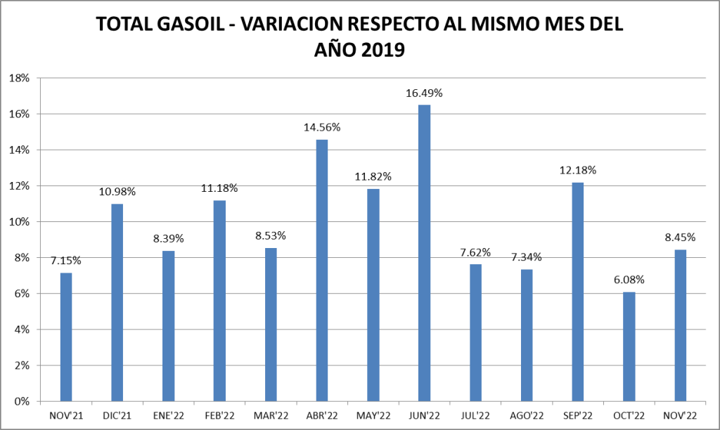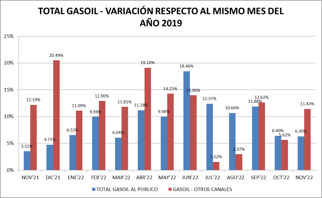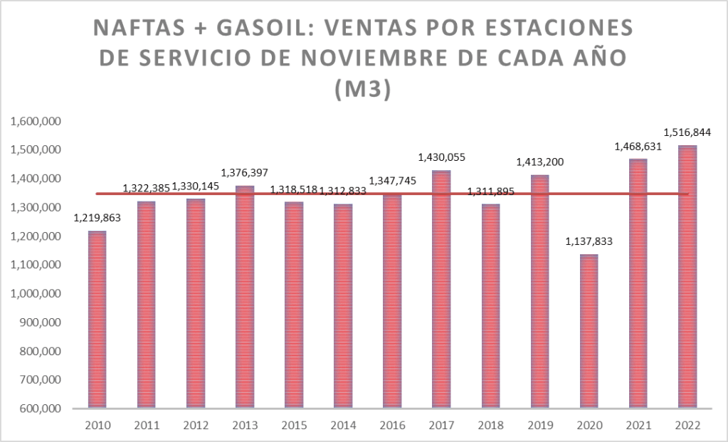 En noviembre de 2022, las ventas totales de naftas cayeron un 2,1 % respecto al mes anterior, mientras que las de gasoil subieron un 2,9%.