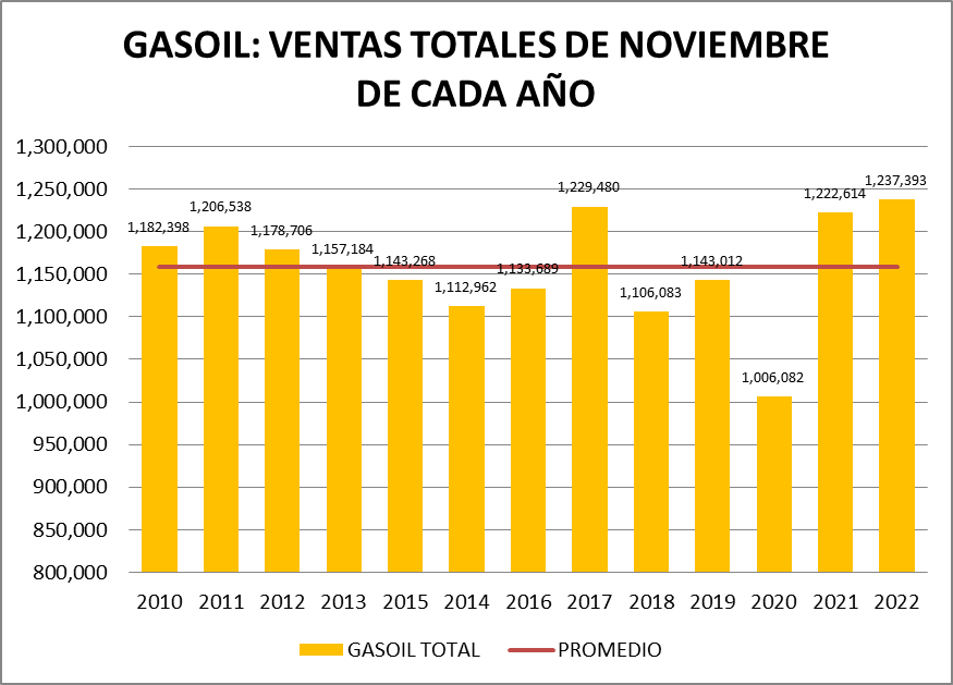 En el gráfico que mostramos a continuación puede verse que, en el caso del gasoil, es noviembre de 2022 el mejor noviembre de los últimos diez años: