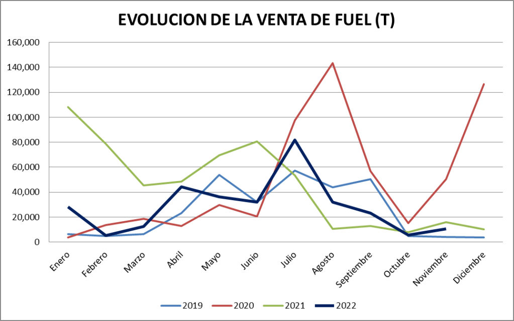 Las ventas de fuel oil registradas en noviembre son 10.530 toneladas, cifra inferior a lo realizado en el año 2021 (15.955 t).