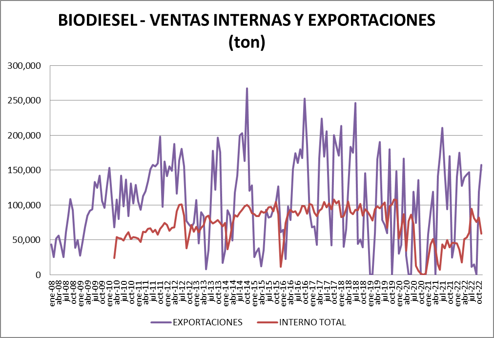 Para el biodiesel, la información parte desde enero de 2008 para las exportaciones y desde febrero de 2010 para la venta a refinerías.