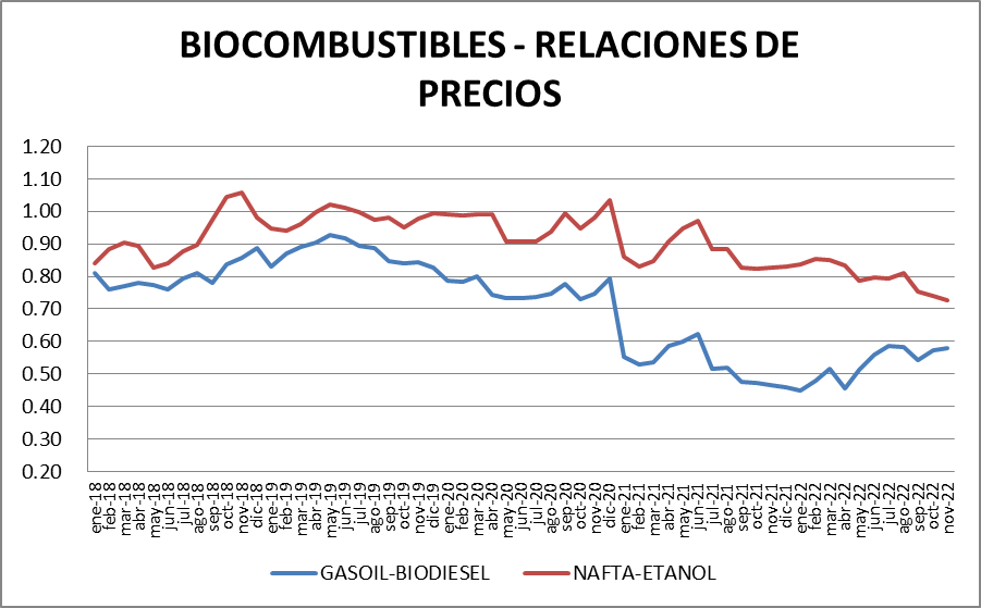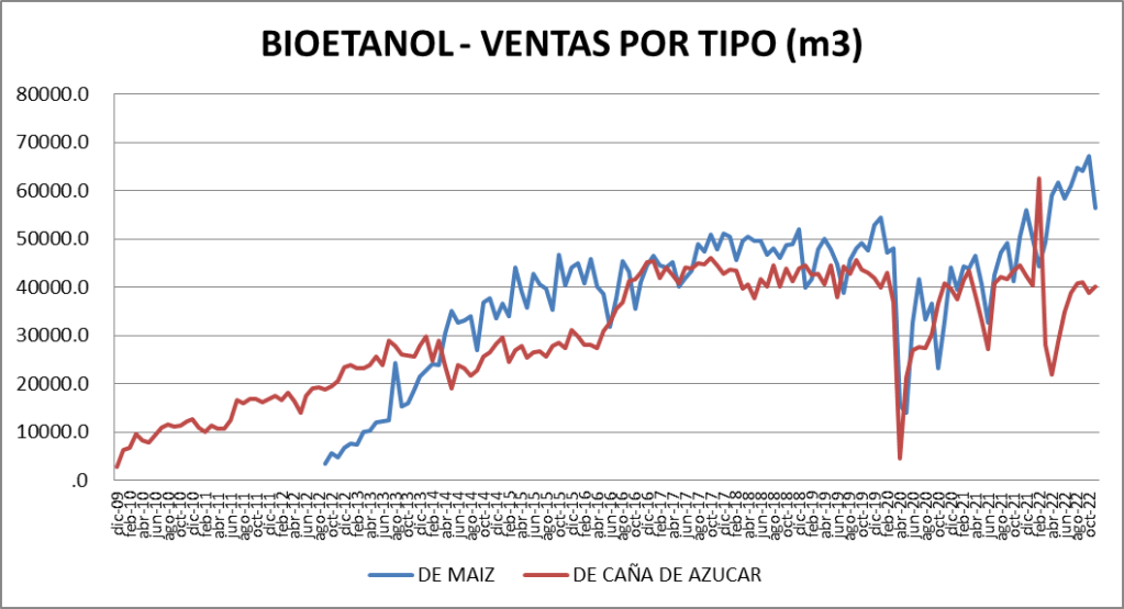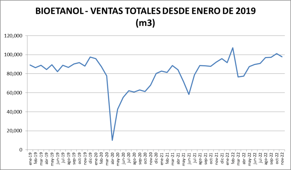 El etanol (probablemente por el aporte de octanos al blend de naftas) mantuvo su nivel. El contenido de bioetanol en naftas fue del 11,7% en noviembre de 2022 respetando el promedio histórico.