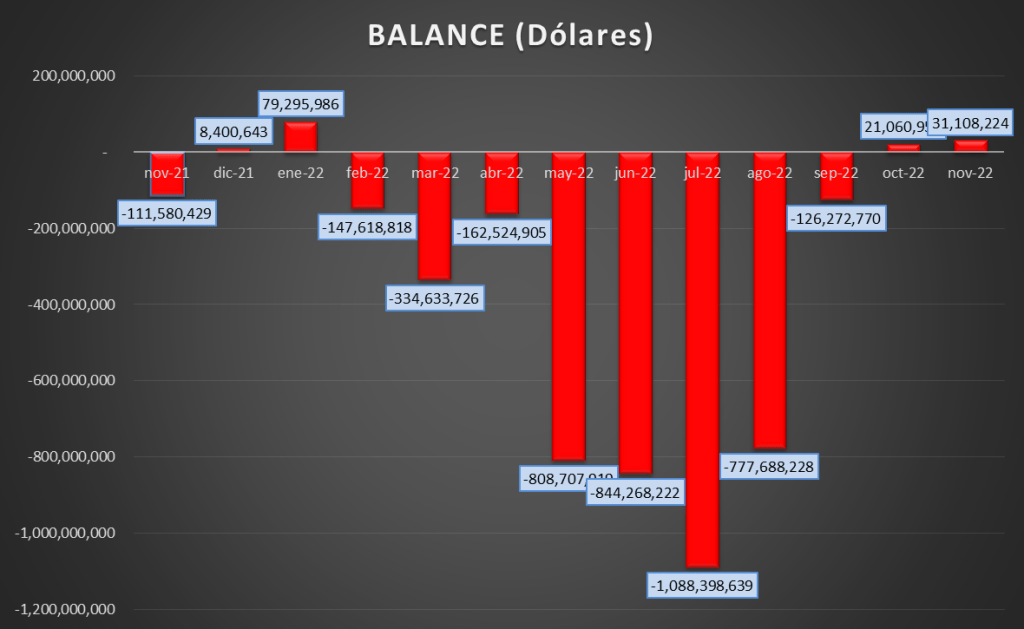 Con estos valores el acumulado a noviembre de la balanza arroja un negativo de 4.158,6 millones de dólares.