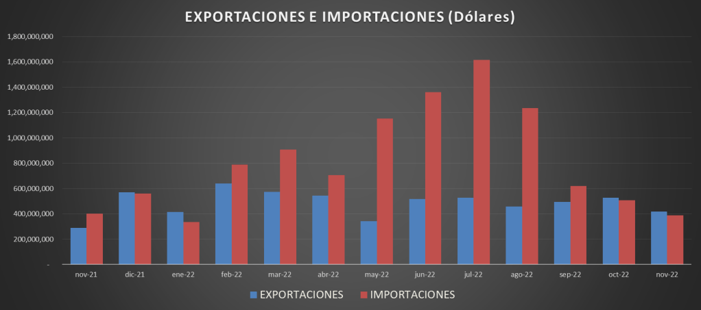 Las importaciones totales en noviembre de 2022 fueron de 388,3 MMu$s y las exportaciones de 419.4 MMu$s, resultando un balance positivo de 31,1 MMu$s.