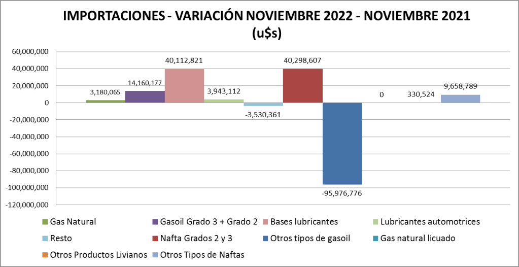 La importación de combustibles terminados, como el gasoil (grado 2 + grado 3), con 157,4 MMu$s y las naftas con 87,1 MMu$s fueron importantes. Entre ambos productos se importó 56,9 millones de dólares más que noviembre de 2021.