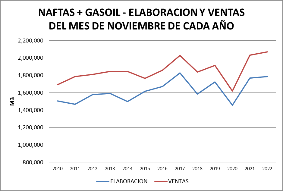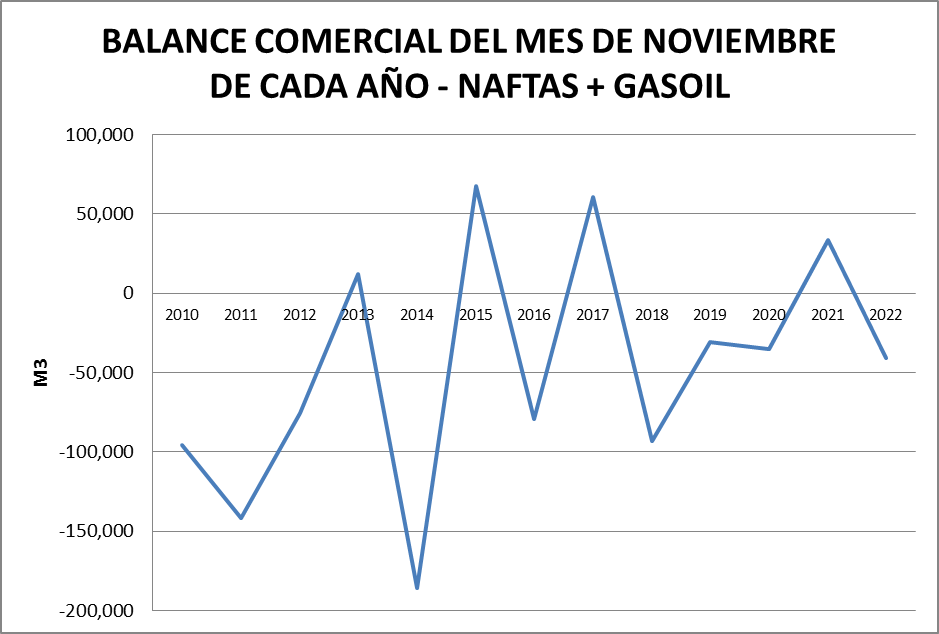 Para el análisis que presentamos a continuación, que tiene como objetivo realizar un Balance Comercial, tomaremos los volúmenes de nafta grado 2, nafta grado 3, gasoil grado 2 y gasoil grado 3, correspondientes al mes de noviembre de cada año (último dato disponible).