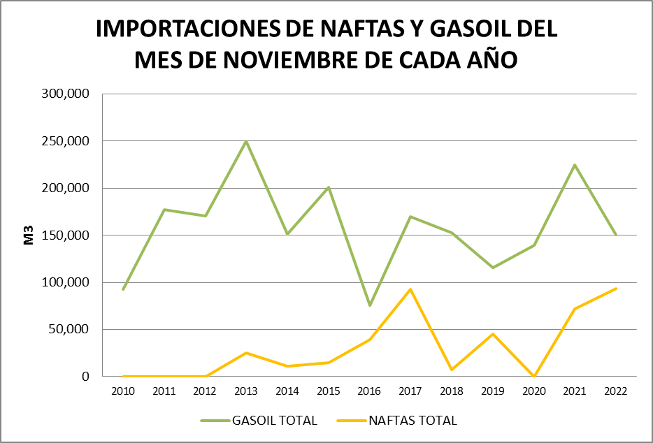 En noviembre de 2022, al igual que en los meses anteriores del mismo año, aparece un balance negativo de gasoil grado 2 que podrían significar problemas de abastecimiento puntuales.