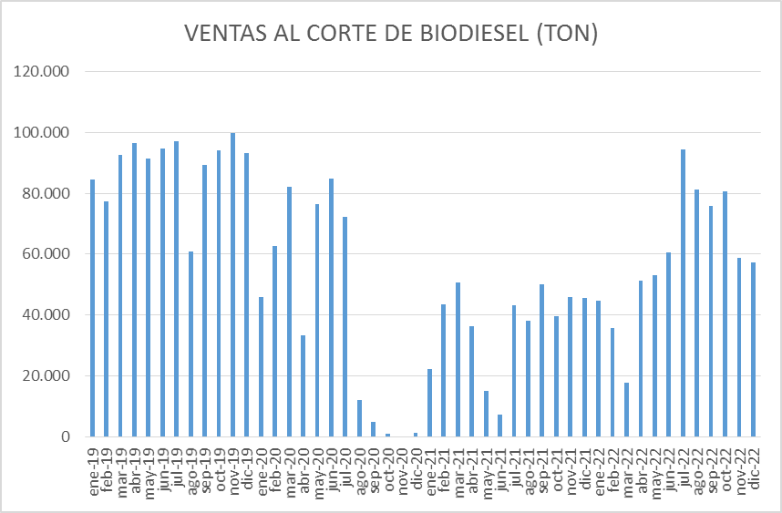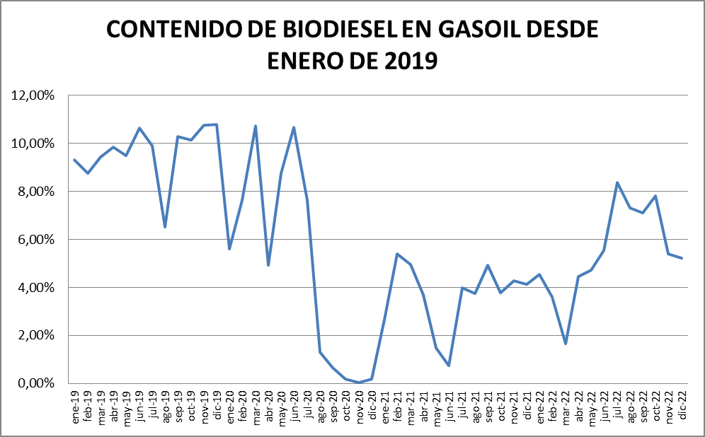 La evolución, desde enero de 2019, se puede apreciar en el siguiente gráfico en el que veremos, claramente, el efecto producido por la nueva Ley y, a posteriori, la recuperación por la necesidad generada por la importación creciente de gasoil y el desabastecimiento de junio/julio de 2022.