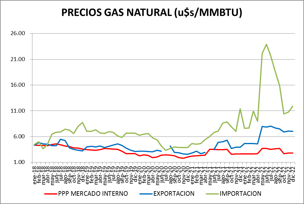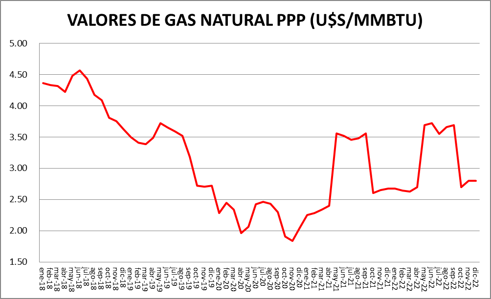 En diciembre de 2022 no se producen modificaciones de los precios promedio a nivel general. El valor de 2,80 dólares por millón de BTU es, además, un 4,87% mayor que el de diciembre de 2021.