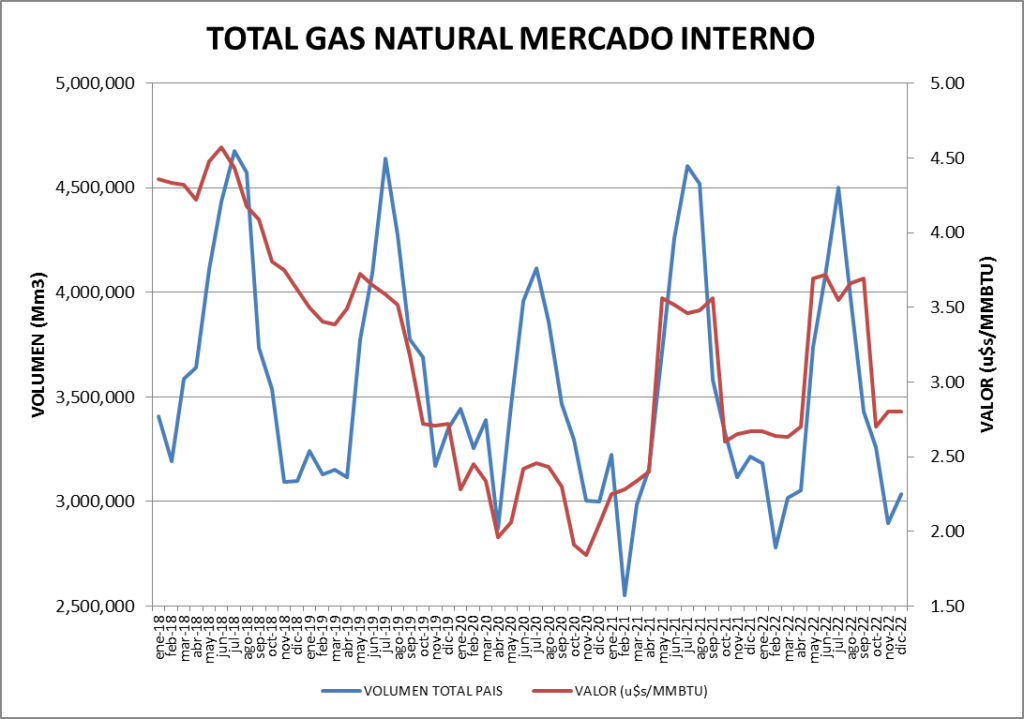 El volumen total comercializado en el mercado interno (97,64 MMm3/día) resulta, en diciembre de 2022, un 5,57% inferior al mismo mes del año anterior y un 4,82% por encima de noviembre de 2022.