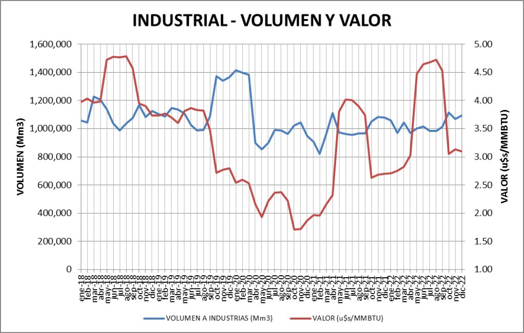 El valor del gas natural con dirección al sector industrial bajó un 0,96% en diciembre de 2022 respecto a noviembre de 2022.