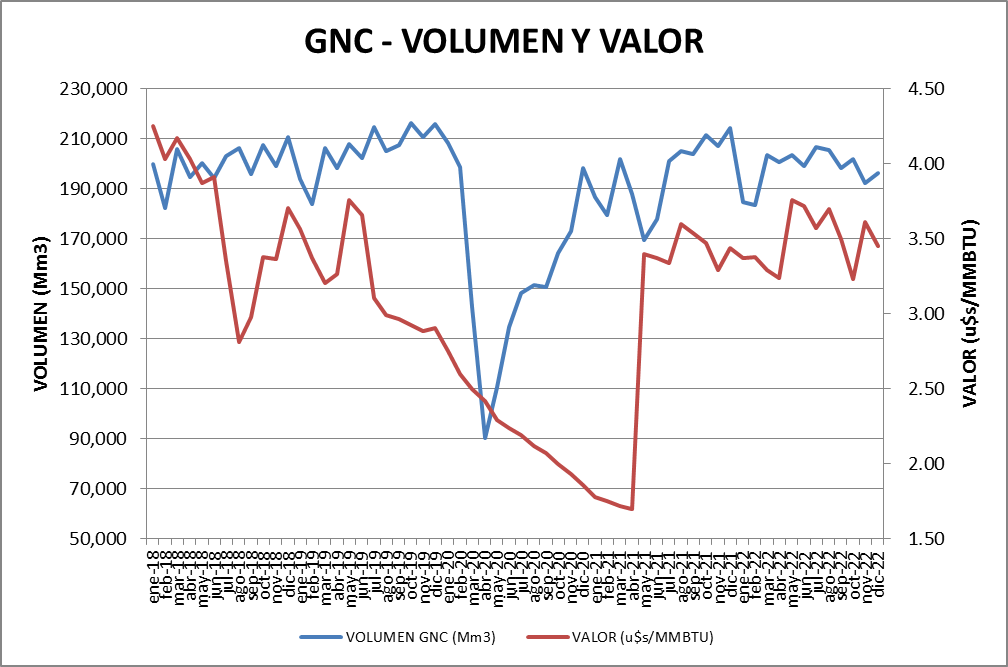 Se vendieron, en noviembre de 2022, 6,33 MMm3/día de Gas Natural Comprimido, valor un 2,12% por encima del mes anterior y un 8,46% inferior al de diciembre de 2021.