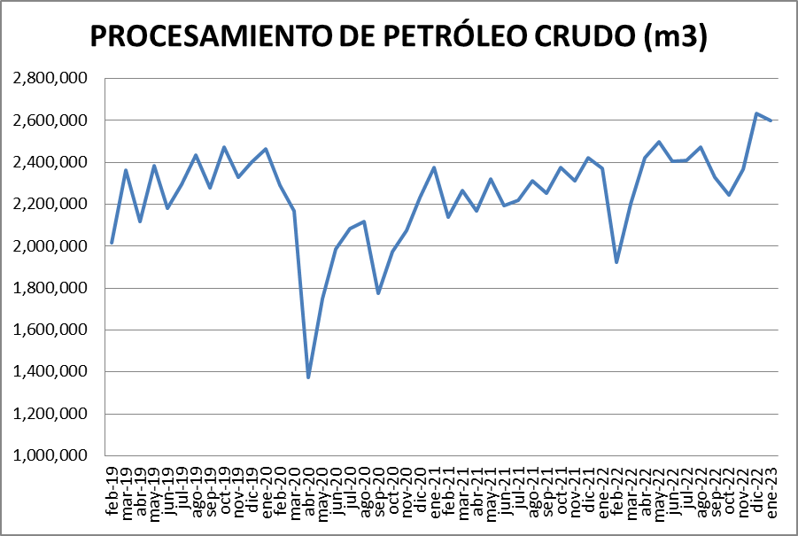 Respecto a enero de 2022 se procesó un 9,73% más de petróleo crudo.