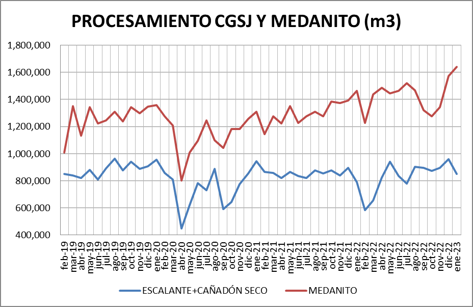 Escalante – Cañadón Seco: Se procesó, en enero de 2023, un 11,46% menos que en diciembre de 2022 y un 7,59% más que en enero de 2022.