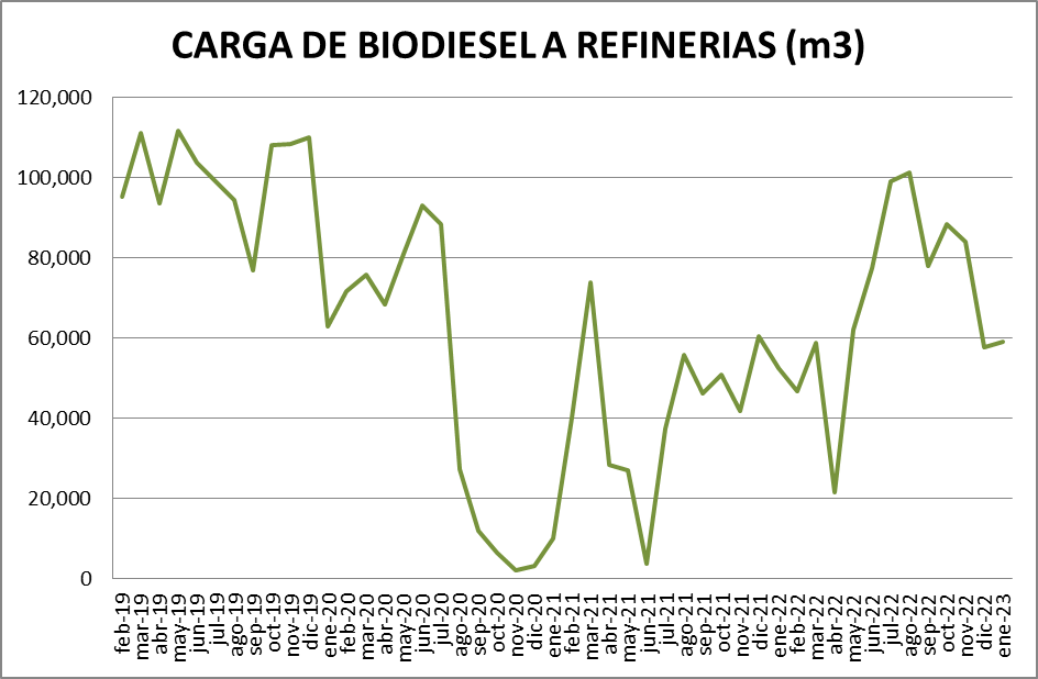 La carga de biodiesel en refinerías se incrementó, en enero de 2023, un 2,11% respecto al mes anterior.