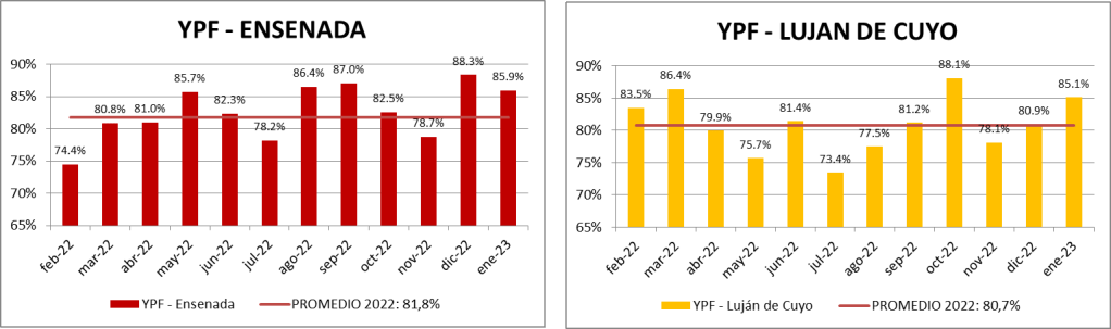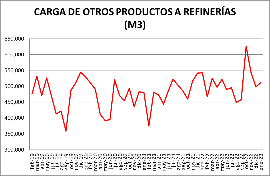 Dentro del rubro “Otras cargas” donde ” se encuentran: naftas sin terminar, mejoradores octánicos, cortes de gasoil, nafta virgen, cortes de kerosene, nafta reformada, destilado de vacío, etc., la evolución fue la siguiente: respecto a diciembre de 2022: +2,66%; respecto a enero de 2022: -5,67%.