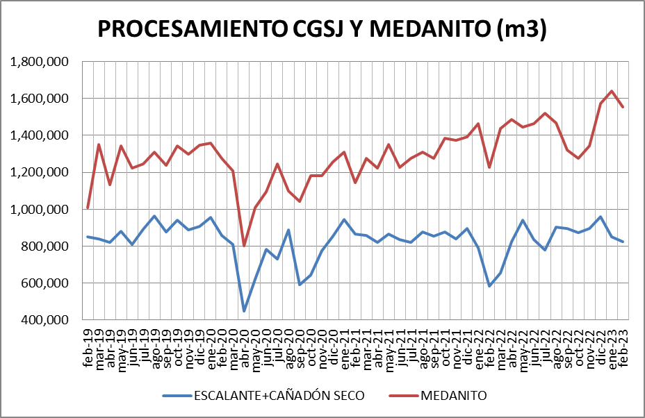 Escalante-Cañadón Seco: Se procesó, en febrero de 2023, un 2,99% menos que en enero de 2023 y un 41,16% más que en febrero de 2022.