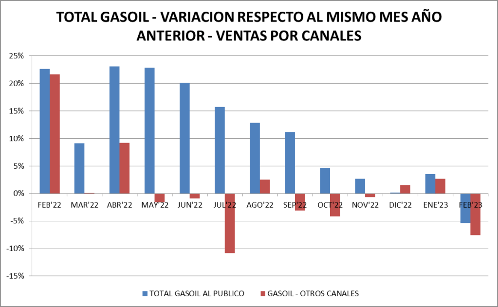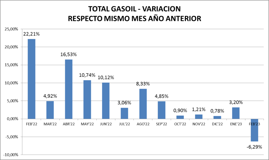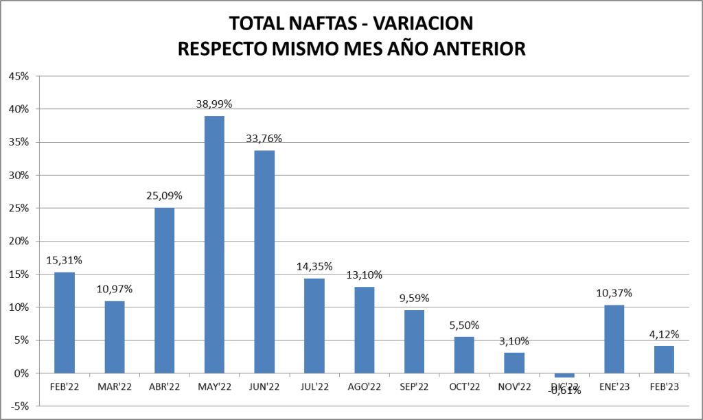 Respecto a febrero de 2022, las naftas crecieron un 4,12%, constituyéndose en el mejor febrero desde el año 2010. El gasoil sufrió un descenso del 6,29% en relación a un año atrás.