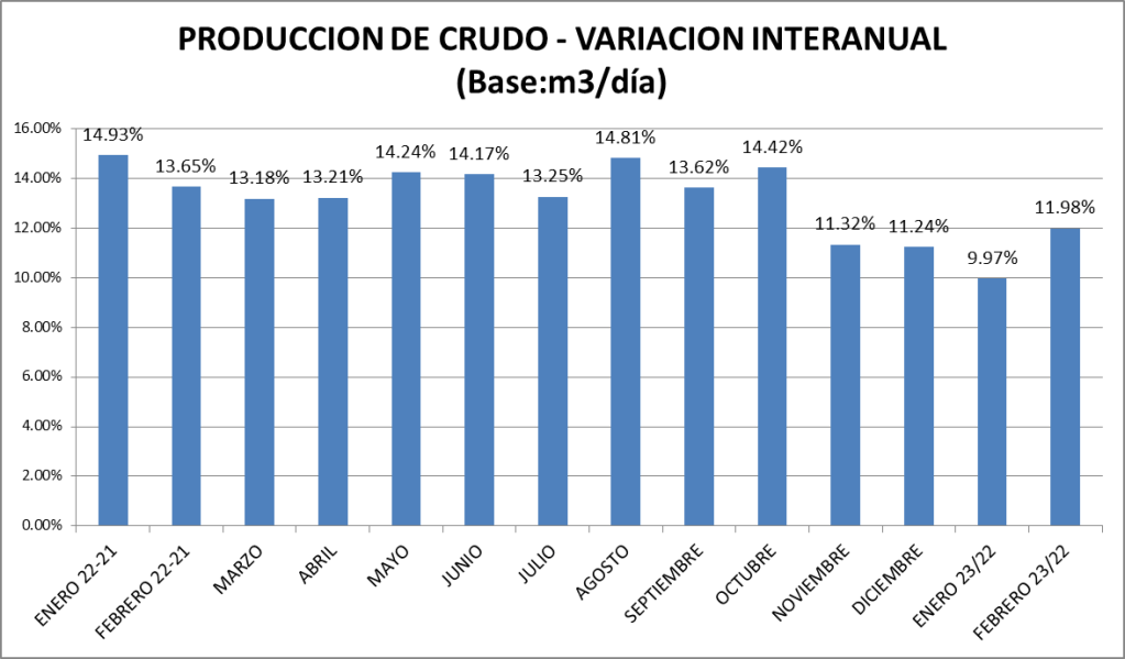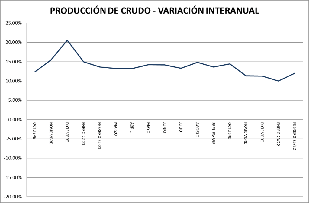 La producción diaria promedio de petróleo crudo del país en febrero de 2023 subió un 1,76% respecto a enero de 2023, a pesar de tener tres días menos de producción. Con respecto a febrero de 2023 la producción es un 11,98% superior.