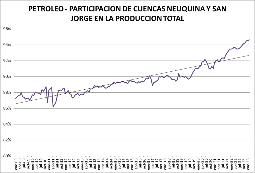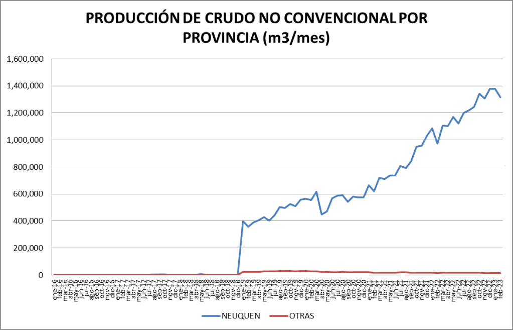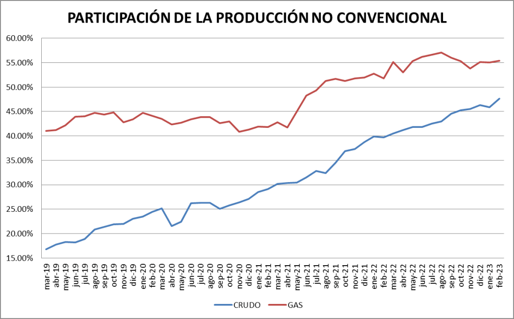 La participación del crudo no convencional en el total de la producción nacional fue, en febrero de 2023, del 47,62%, lo que constituye un nuevo récord.