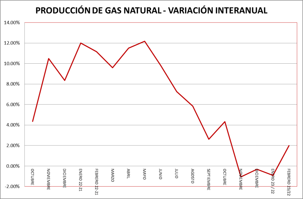 La producción de gas natural de los meses de febrero de cada año puede verse en el gráfico a continuación:
