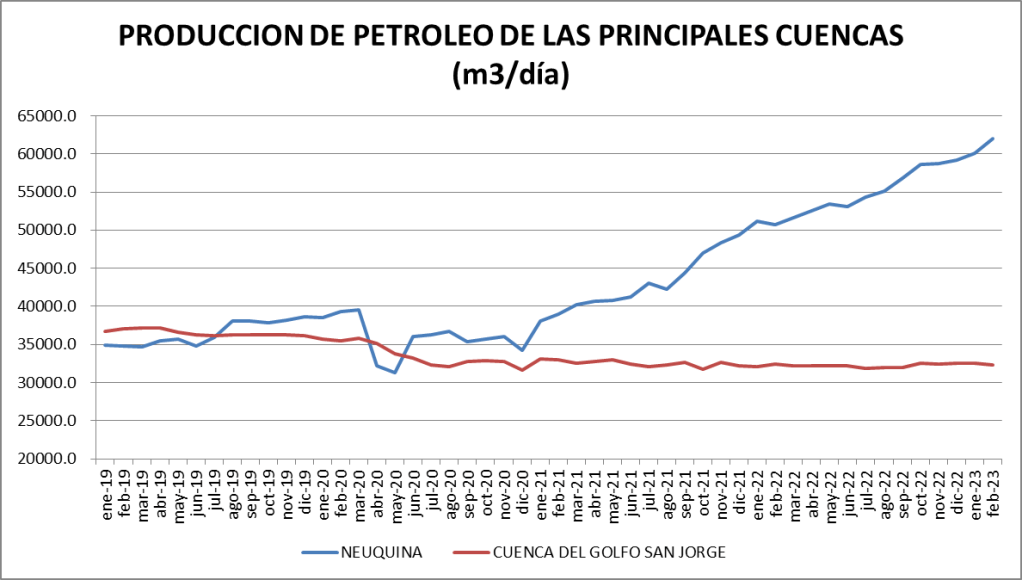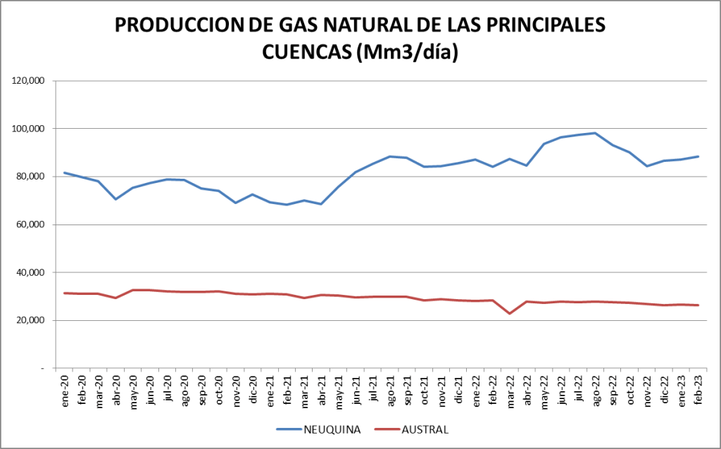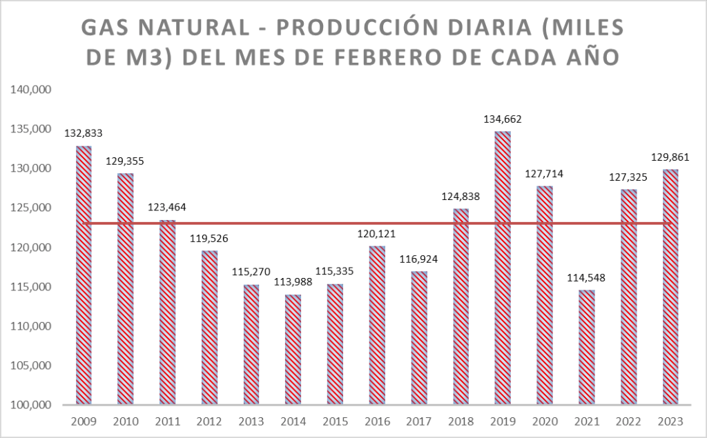 La producción diaria de febrero de 2023 es superior al promedio de la serie (que incluye el valor de 1999 y es 89.029 m3/día).