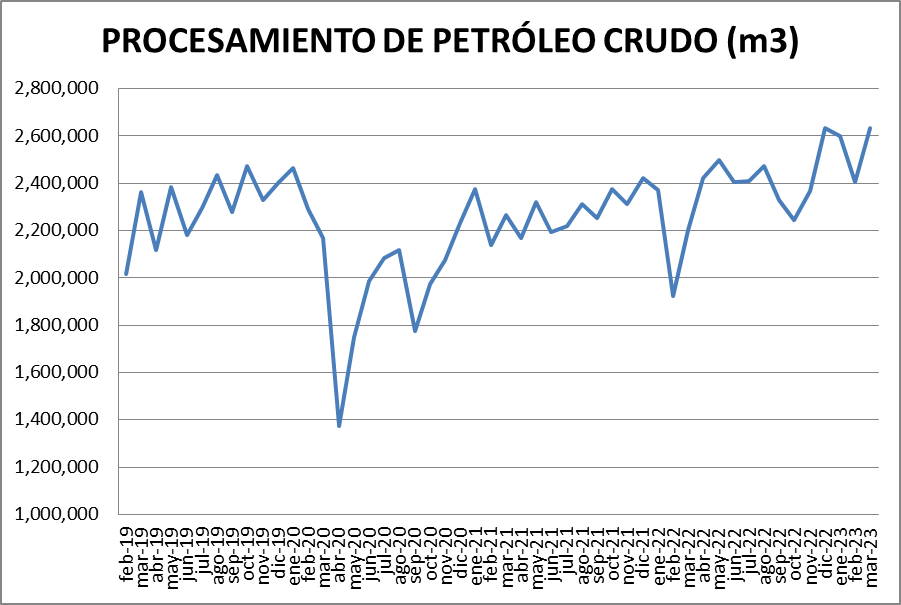 En marzo de 2023, el procesamiento de petróleo crudo subió un 9,4% respecto del mes anterior.