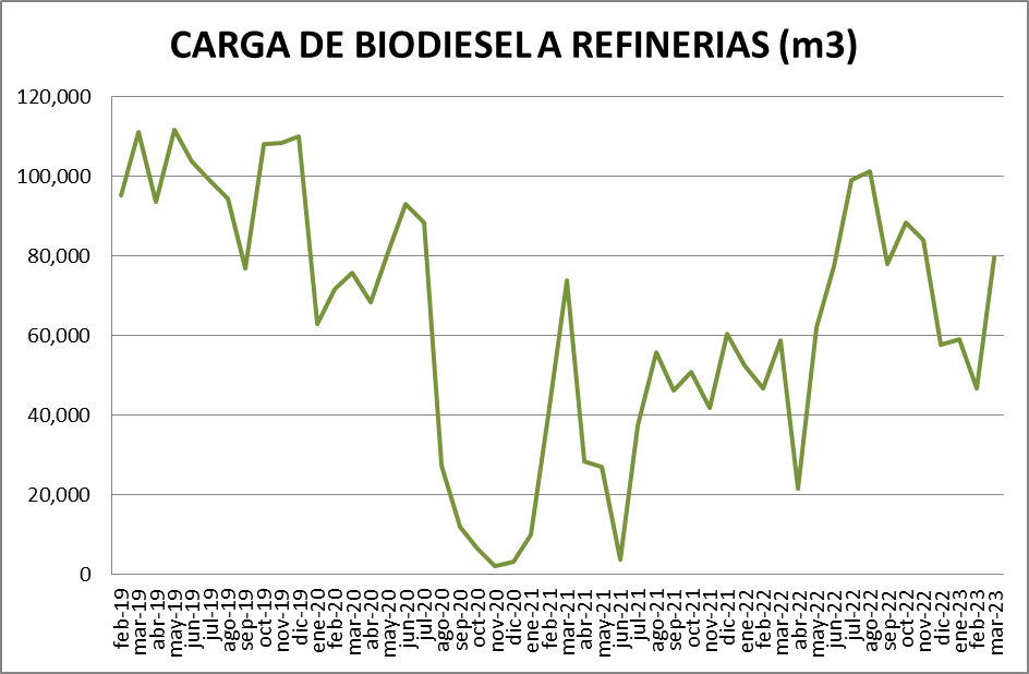 La carga de biodiesel en refinerías se subió, en marzo de 2023, un 70,12% respecto al mes anterior.