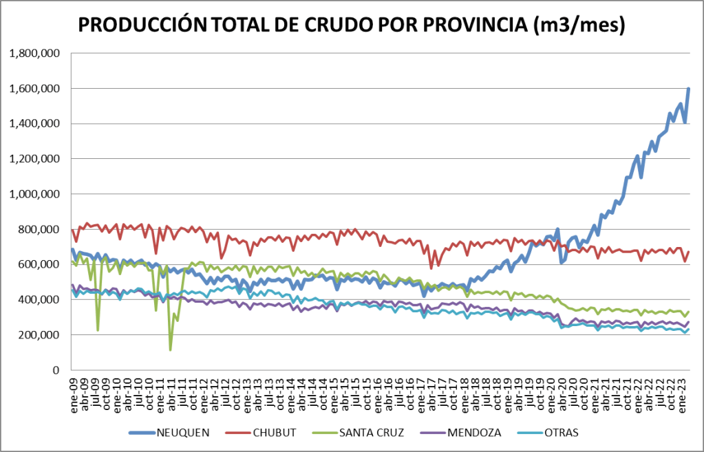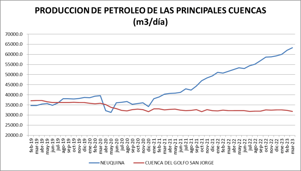 La producción diaria de marzo de 2023 es superior al promedio de la serie (que incluye el valor de 1999 y es 89.227 m3/día).