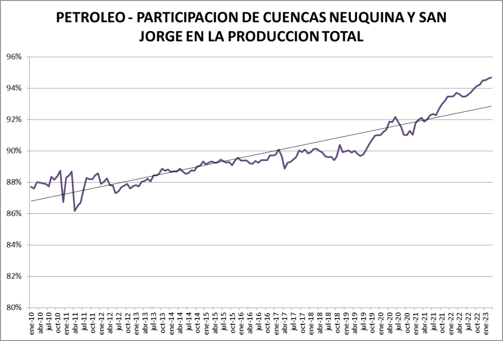 La Cuenca Neuquina es la que más sigue creciendo interanualmente, apoyando su producción en Vaca Muerta (+22,44%, interanual). La segunda cuenca en importancia, la del Golfo San Jorge bajó un 1,30%.