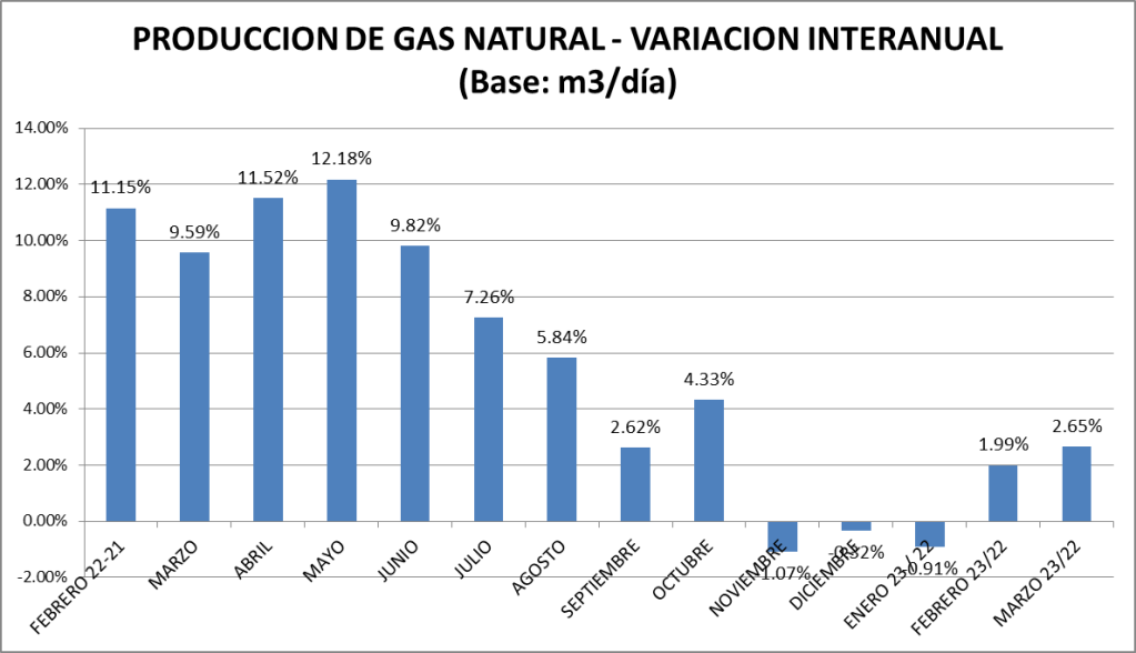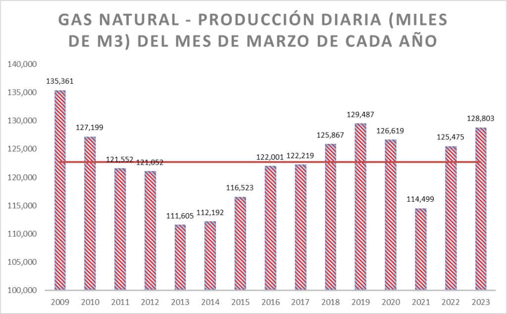 La producción de gas natural de los meses de marzo de cada año puede verse en el gráfico a continuación: