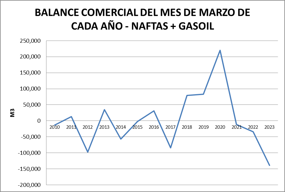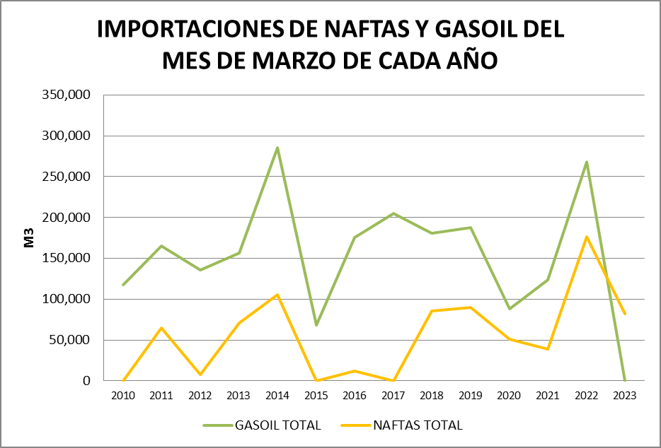 En el gráfico se ve la inexistencia de importaciones de gasoil en el mes de marzo de 2023, cuestión que no había ocurrido nunca en el período analizado.