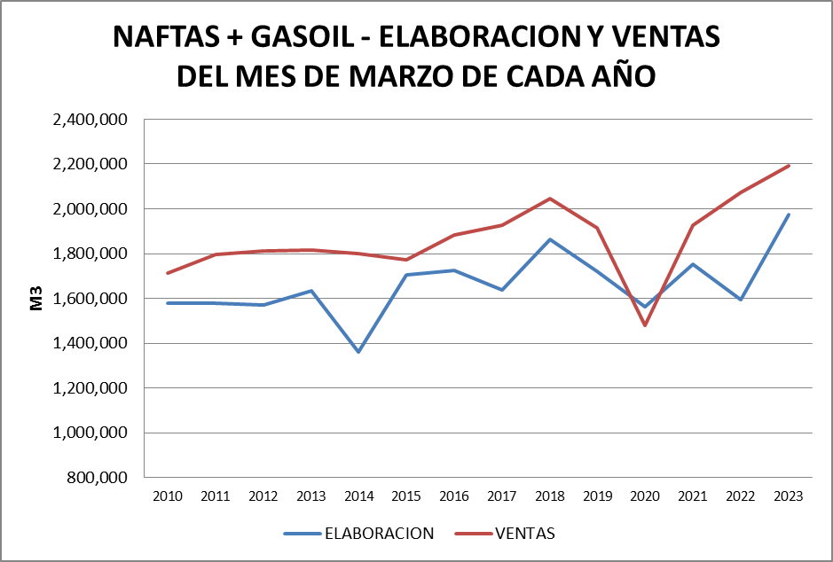 En el gráfico se destaca la elaboración de ambos productos, que es la mayor para cualquier marzo de la serie, y que acerca mucho a la curva de importación.