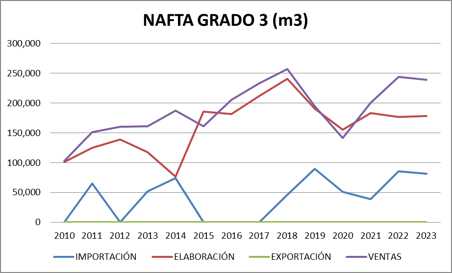 La importación de los cuatro productos representó en marzo de 2023 cerca del 3,73% del total vendido ya que solamente se importó nafta grado 3. El 34,2% de esta nafta vendida en el mercado interno provino del exterior.
