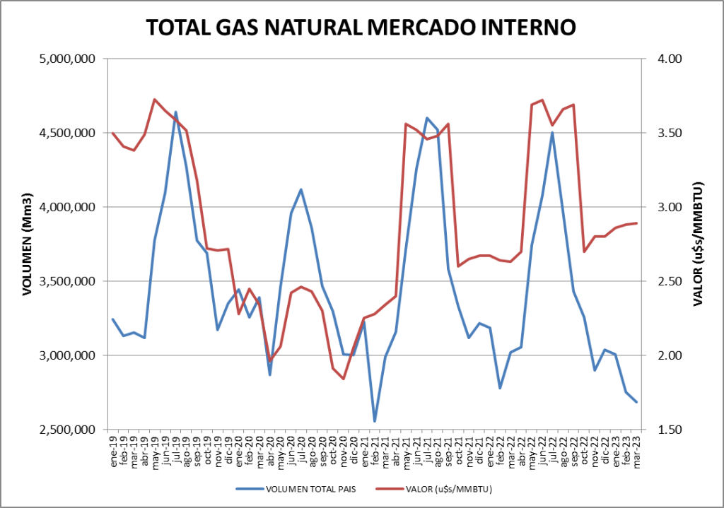 El volumen total comercializado en el mercado interno (86,61 MMm3/día) resulta, en marzo de 2023, un 11,06% inferior al mismo mes del año anterior y un 2,40% también por debajo de febrero de 2023.