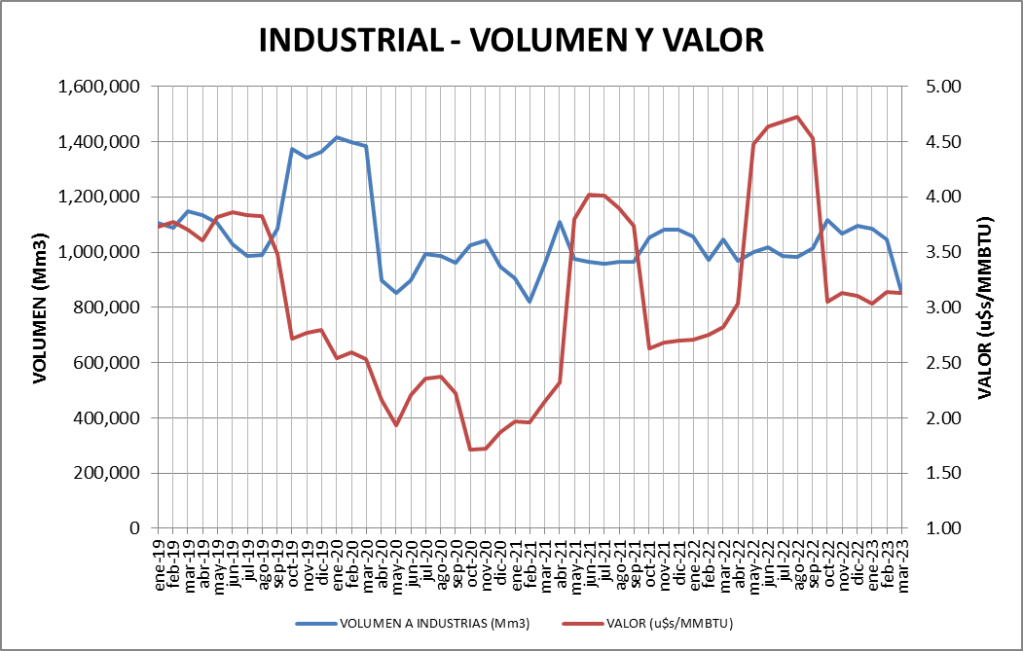 El valor del gas natural con dirección al sector industrial bajó un 0,32% en marzo de 2023 respecto a febrero de 2023.